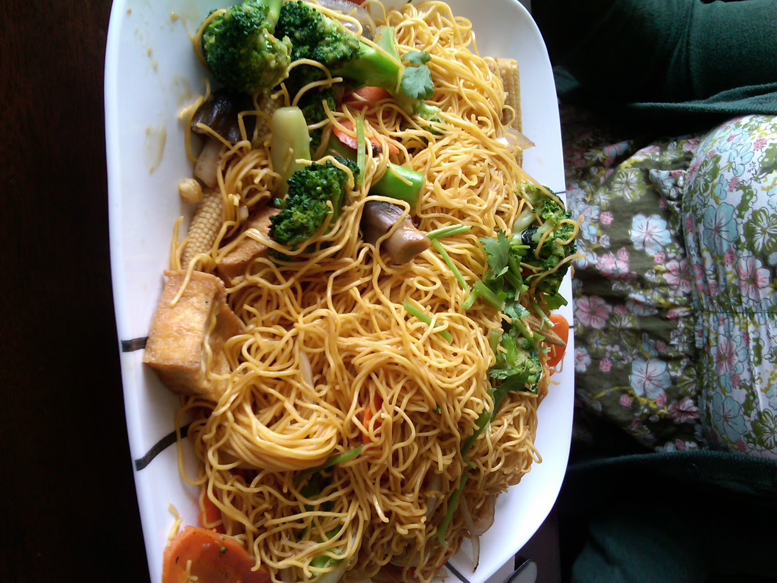 neon green and cold, she offered a pot of simple syrup, which i accepted. i like my tea to be sweet. so i really liked the idea of getting simple syrup to mix in, because i hate having to dissolve sugar packets into my iced beverage. the simple syrup had been steeped with somesort of spice as well, i felt like it was clove. either way, this was tasty. very herbal, refreshing. i enjoyed it very much so. as far as food, allison ordered (per usual) the Tofu Pad Thai (6.00).